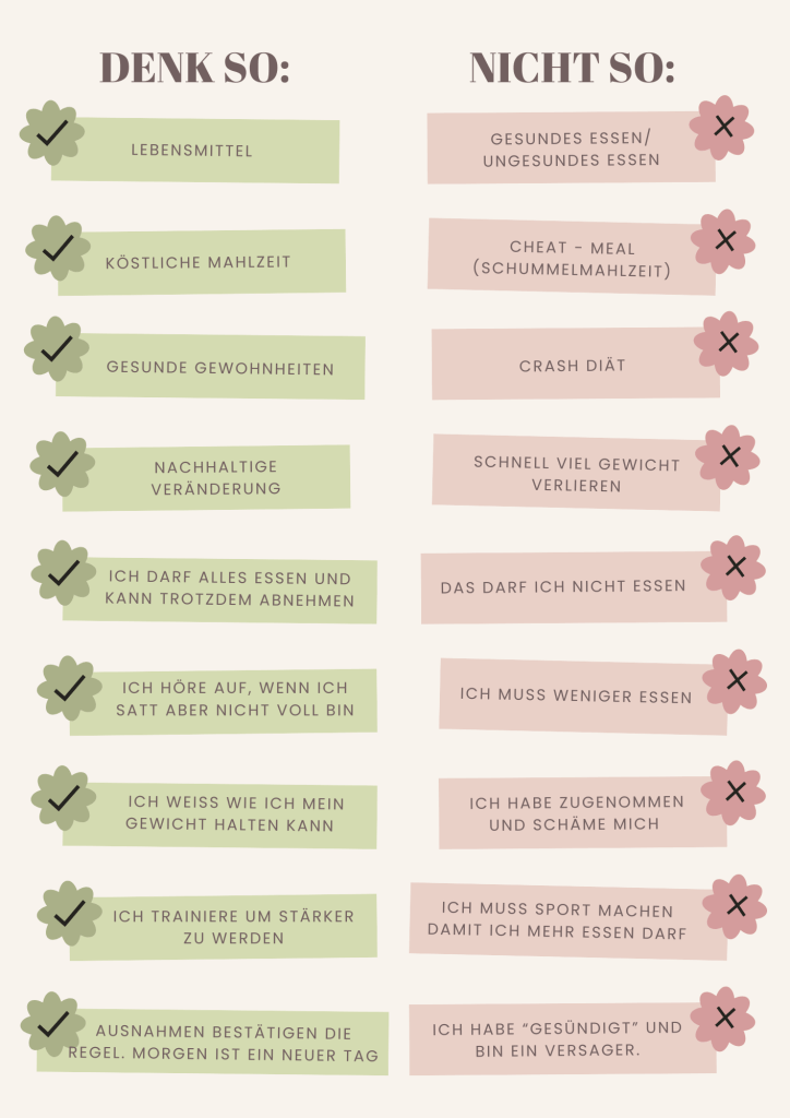 In diesem Artikel erfährst du, warum deine inneren Formulierungen rund ums Essen, Abnehmen und Sport so entscheidend sind – und wie du sie zu deinem Vorteil nutzen kannst. 💡 Schau dir dazu auch das Bild weiter unten an. Es zeigt dir, welche Denkweisen förderlich sind – und welche du lieber über Bord werfen solltest.